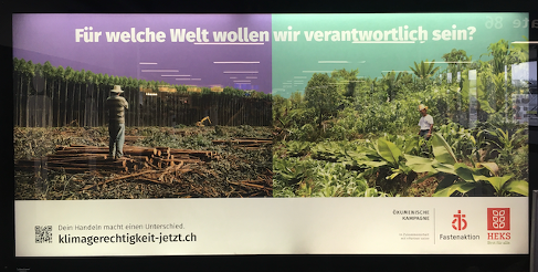 Es una campaña ecuménica de HEKS. Brot für alle [Pan para todos], una ONG de la iglesia evangélica reformada suiza. Misioneros protestantes con una iniciativa interconfesional. El QR del cartel abre la página web de la campaña “Justicia climática”. Y nos interpela ”¿Consumes alimentos de forma responsable?” Nos habla de gases de efecto invernadero, de consumo regional, de alimentos de temporada. De cómo las personas que menos contribuyen al cambio climático son las que más sufren sus consecuencias, y de hambre. Apelan a la justicia climática, las imágenes son claras: monocultivo y deforestación, frente a alimentos y biodiversidad. Más abajo en la web hay un juego para conocer el impacto de nuestros hábitos alimenticios, consejos para el día a día, para poner nuestras vidas “rumbo al clima”, y vídeos sobre acciones en Kenia, Mali, Brasil y Guatemala (no estaba muy desencaminado con mi suposición). Ya no se trata de quien sufre la injusticia climática, sino de nosotros. Piden donaciones, quieren educarnos, y despertar nuestras consciencias.
