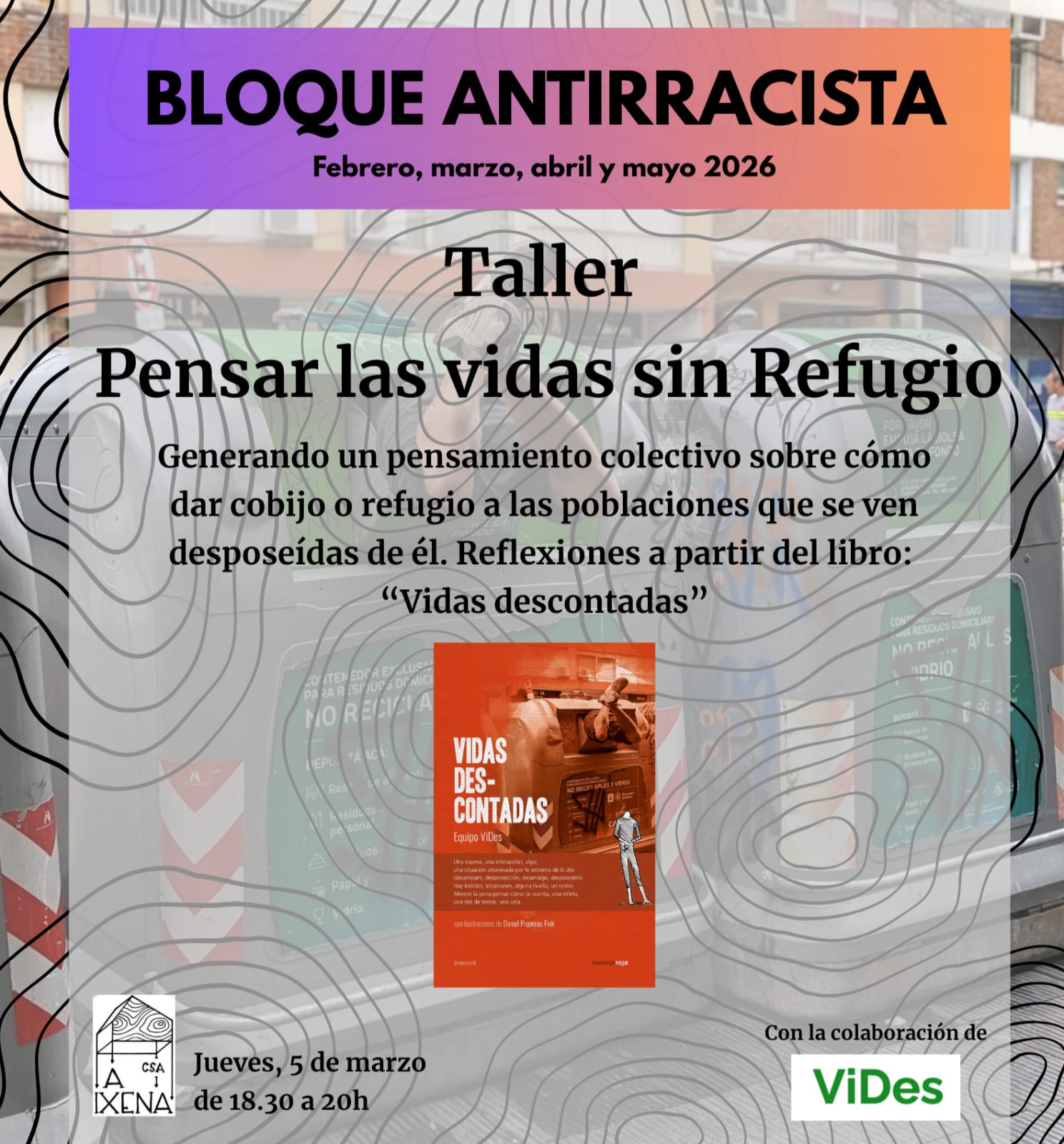En el Centro Social Ixena de Teruel, impulsado por su bloque antirracista, se dialoga para pensar vidas sin refugio a partir del libro Vidas descontadas. La actividad se realizó el 5 de marzo y estuvo a cargo de María Martínez y David Casado-Neira.